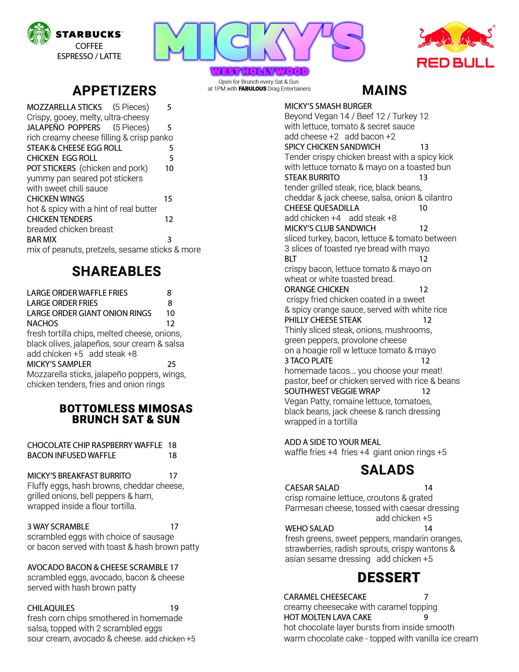 Who said a club can’t serve good food? The Kitchen at Micky’s features a wide variety of mouthwatering food items. Make sure to try our food the next time you’re at the club. Serving food from Mondays at 5PM, Tuesday -Sunday from 12PM! Don’t miss our fabulous Drag Brunch on Saturdays & Sundays 1PM
